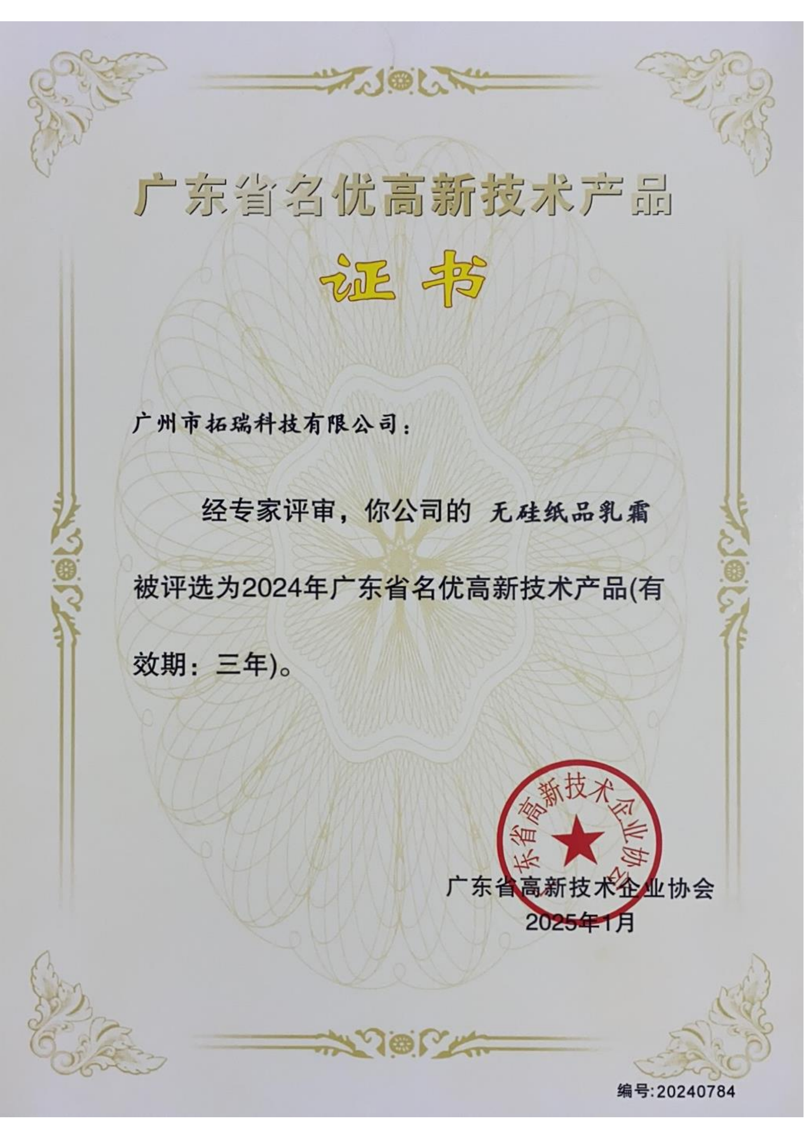 近日,拓瑞科技旗下2款產(chǎn)品:無硅紙品乳霜、冷鏈用復(fù)合消毒劑評選為“2024年廣東省名優(yōu)高新技術(shù)產(chǎn)品”