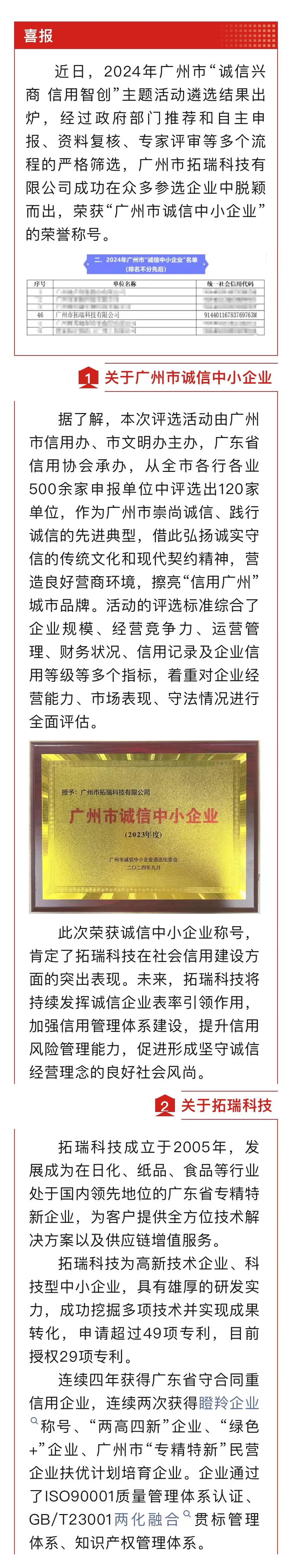 【喜訊】拓瑞科技榮獲“廣州市誠信中小企業(yè)”稱號